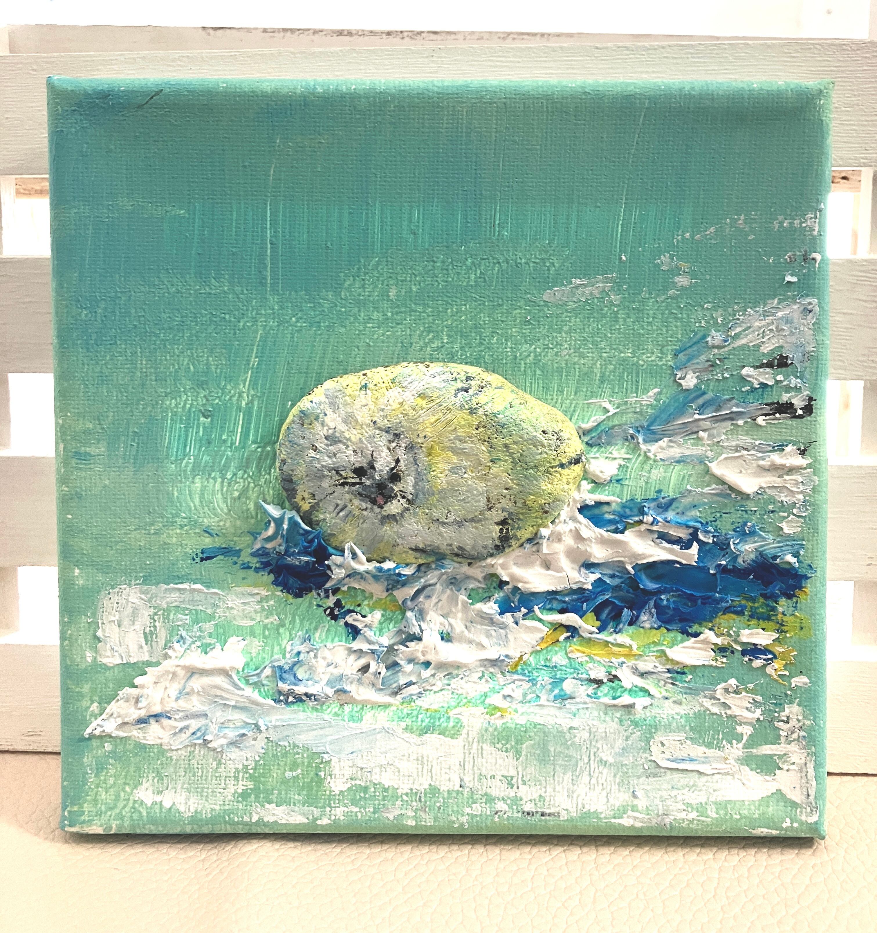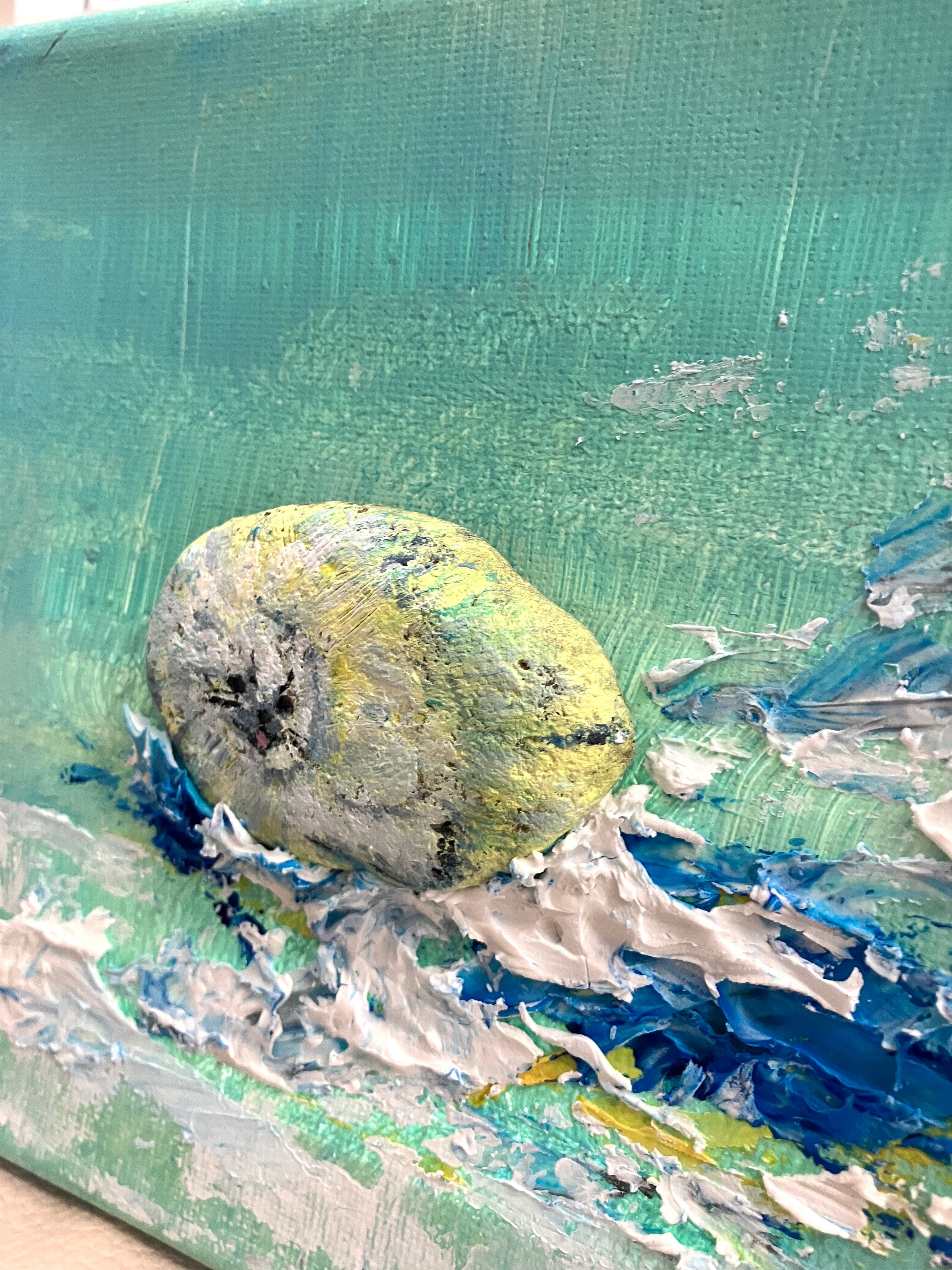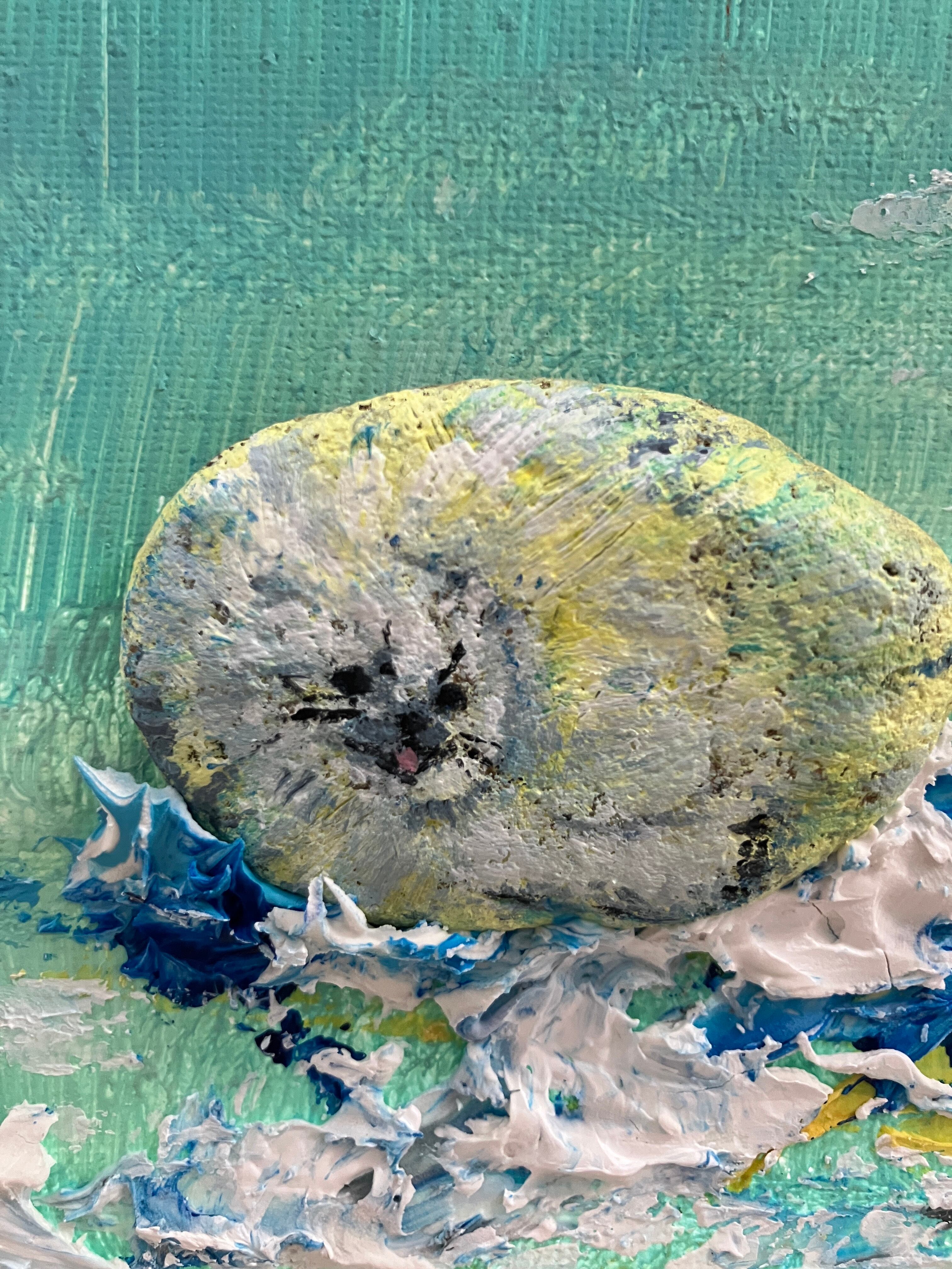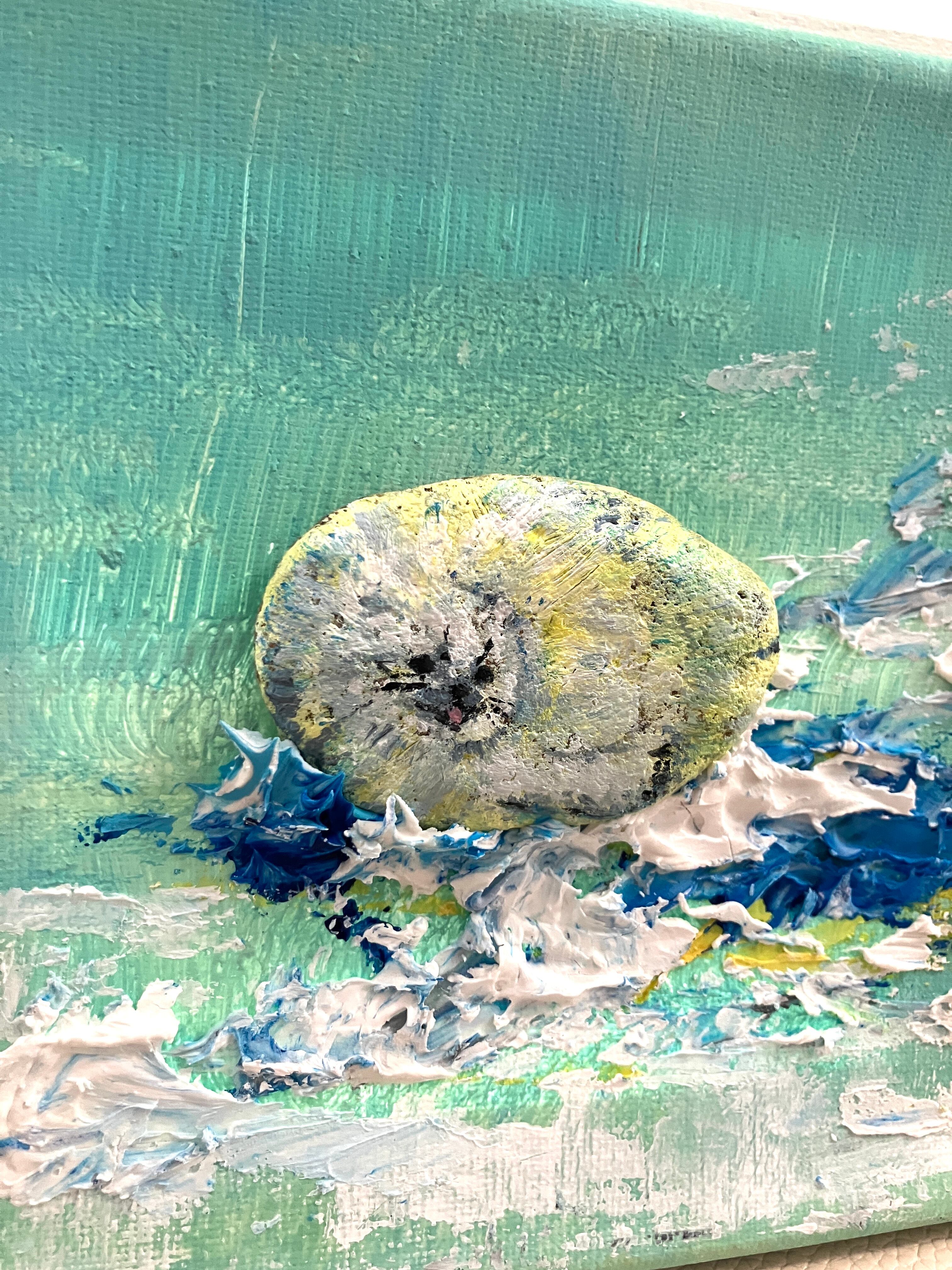 雪の上、日差しに照らされるアザラシの赤ちゃん。ひんやりとした空気と温かなひざし、おだやかなひとときを想像して。雪の表現にこだわりました。